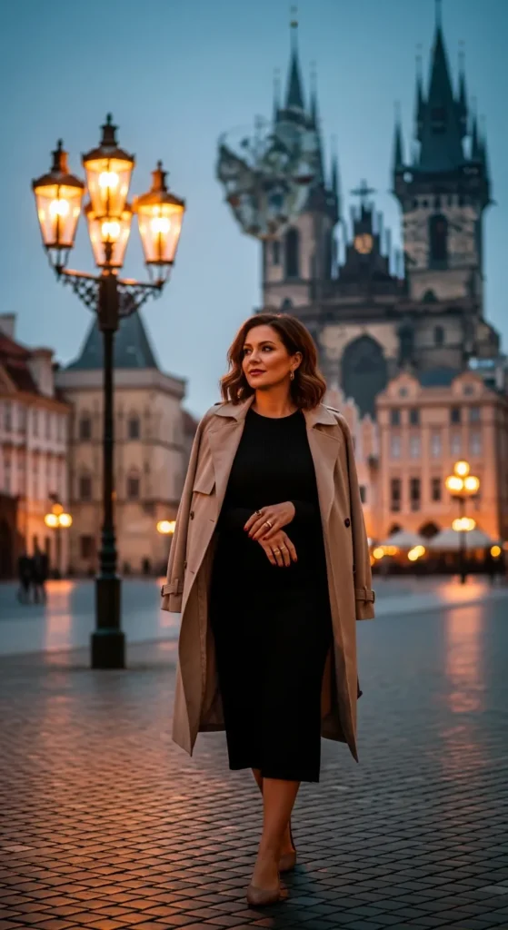 A simple black midi dress layered under a beige trench coat creates understated romance. It’s classic, photogenic, and perfect for evening dinners near Old Town.