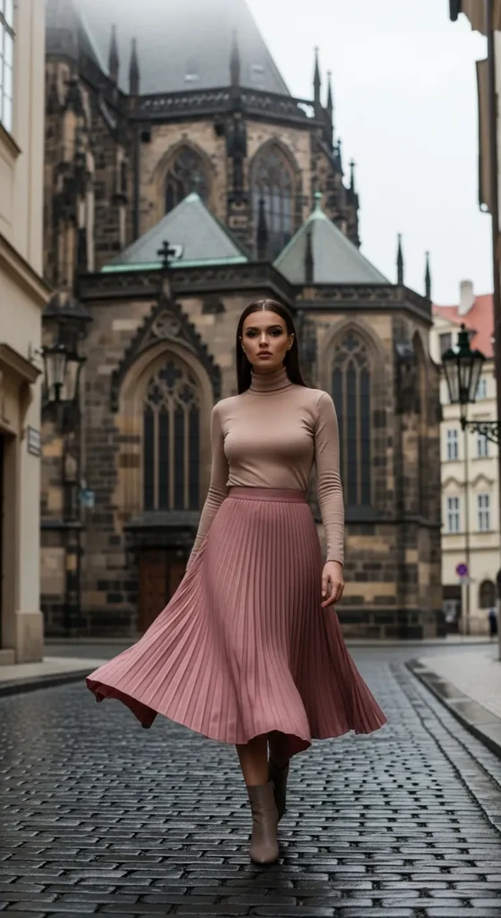 A pleated midi skirt paired with a fitted soft turtleneck creates timeless elegance for cooler months. The gentle movement of pleats contrasts beautifully with Prague’s gothic structures.