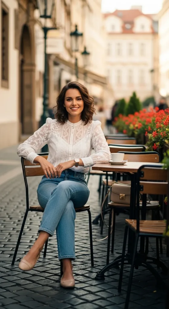 A delicate lace blouse paired with classic straight-leg jeans balances romance and practicality. It’s ideal for casual café mornings and bookstore visits.