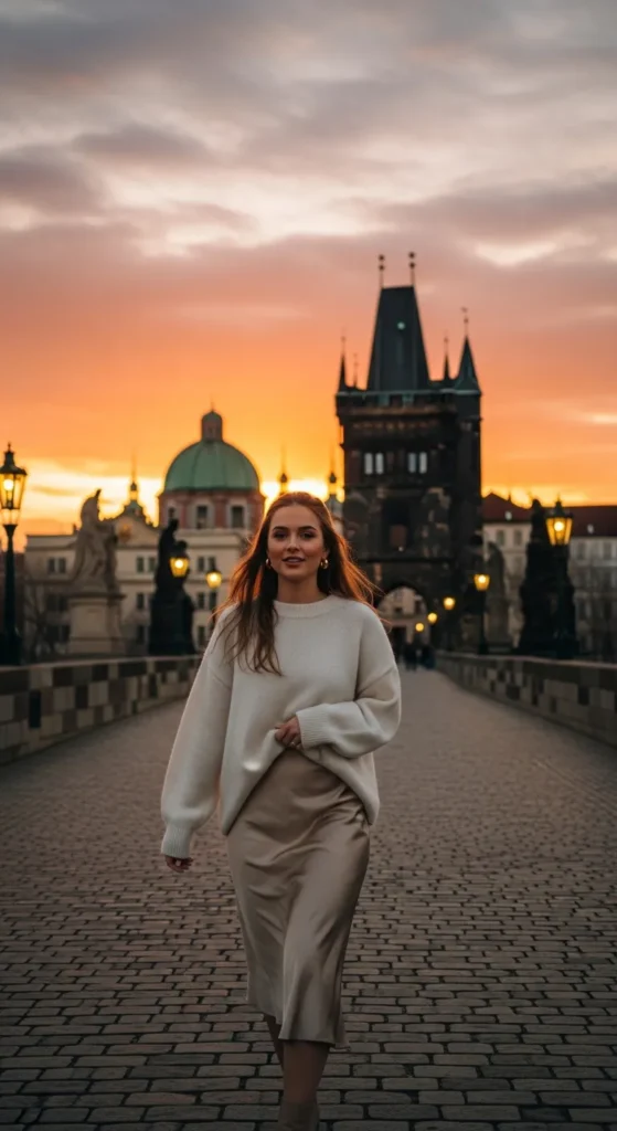 A champagne satin slip skirt paired with a soft oversized cashmere sweater creates that quiet luxury look perfect for a sunset river stroll. The shine of satin contrasts beautifully with Prague’s old stone textures.