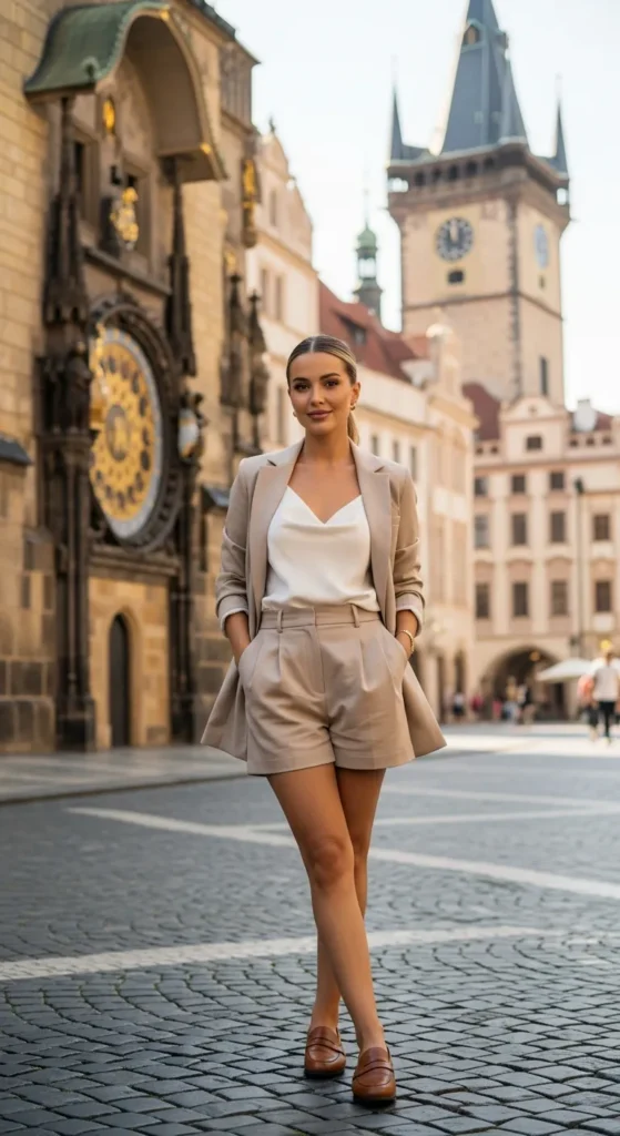 High-waisted tailored shorts paired with a lightweight blazer feel polished yet playful for warm afternoons exploring hidden courtyards.