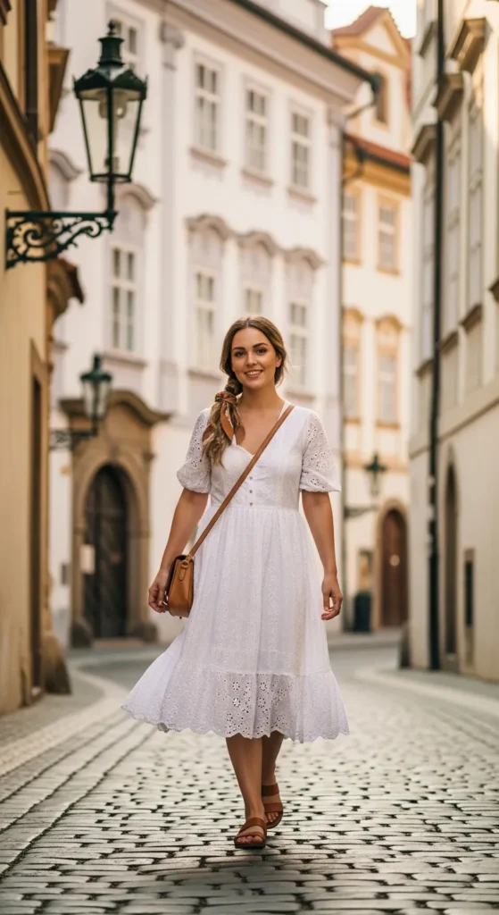 A white eyelet dress feels fresh and youthful against Prague’s historic architecture. The delicate cutwork detailing adds texture without overwhelming the setting, and a tan crossbody keeps it effortless and travel-ready.