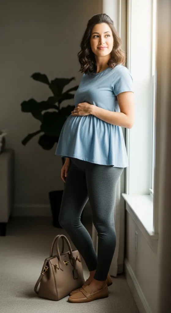 A peplum maternity top provides airflow and shape, paired with soft leggings for comfort, making it ideal for everyday wear when you want ease without sacrificing style.