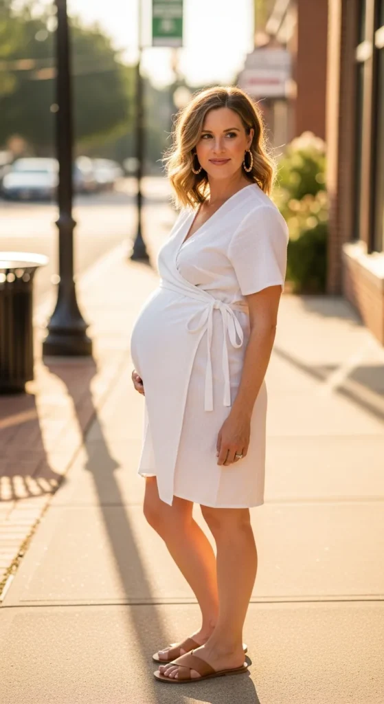 A breathable cotton wrap dress skims the bump gently, adjusts as your body changes, and keeps airflow moving on hot days while still feeling feminine, polished, and effortless for everyday summer outings.