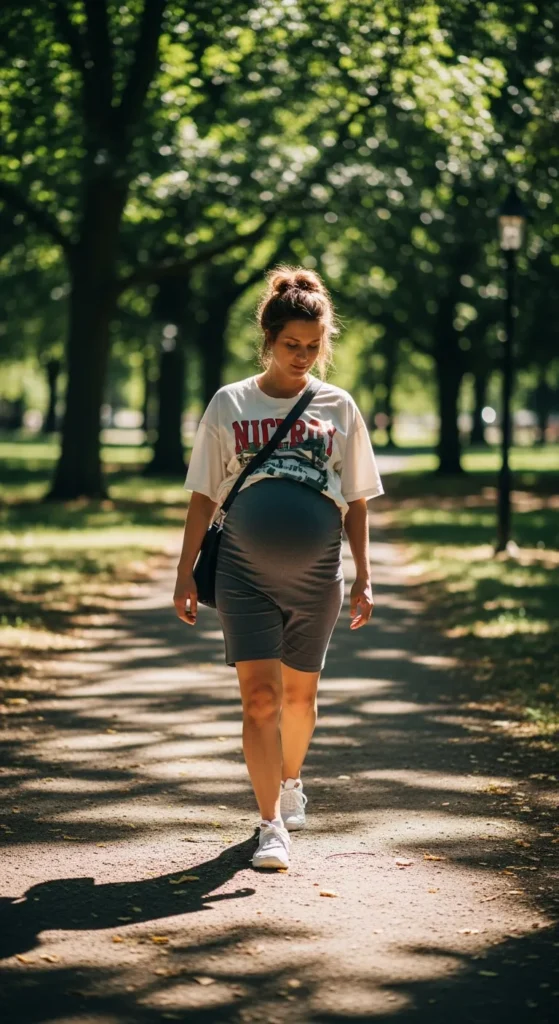 A relaxed graphic tee paired with soft maternity shorts feels youthful, playful, and breathable, perfect for staying cool while still expressing personal style during casual summer days.