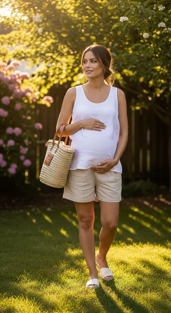 A flowy tank paired with linen maternity shorts keeps things cool, casual, and breathable, perfect for backyard days or relaxed summer afternoons spent moving slowly and comfortably.