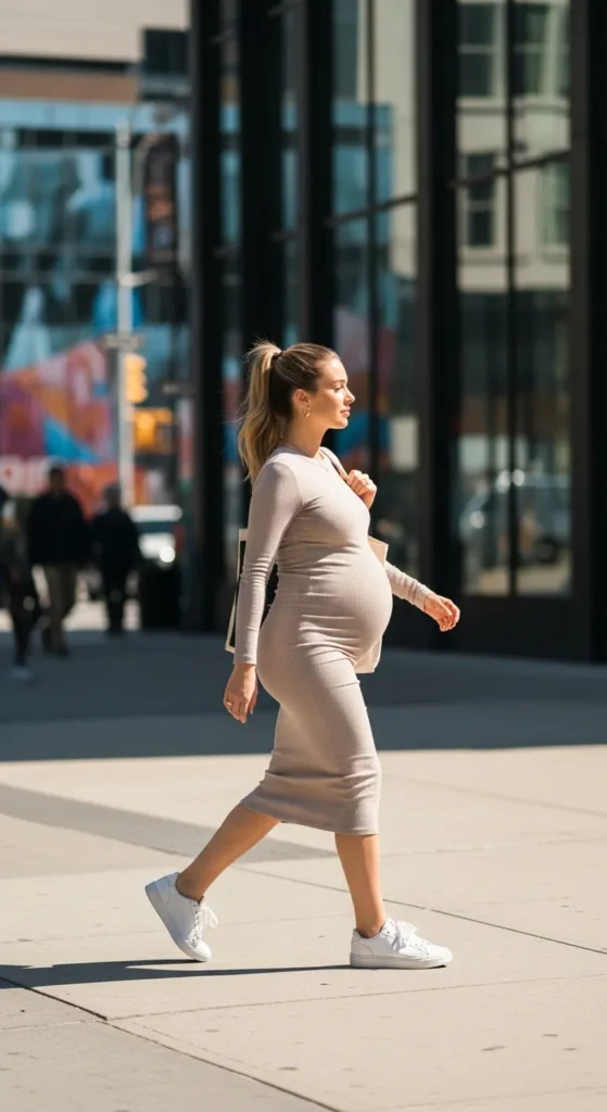 A stretchy midi dress combined with supportive sneakers offers comfort for walking while still feeling modern, clean, and intentionally styled for busy summer days.