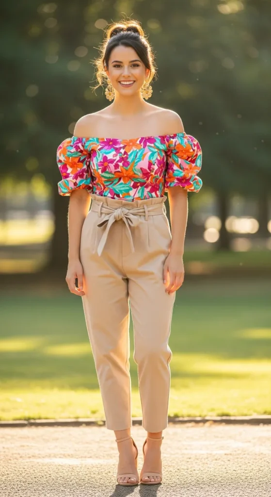 A floral or geometric printed puff sleeve top looks stunning with neutral paper bag waist trousers. This outfit creates a balance between playful and sophisticated, ideal for brunch or casual workdays.