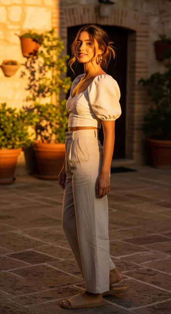 A cropped puff sleeve top with lightweight linen pants offers a chic yet breezy summer look. Neutral tones create an understated elegance suitable for casual dinners or outdoor events.