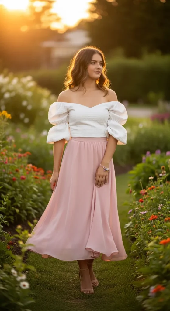 An off-shoulder puff sleeve top paired with a flowing midi skirt creates a romantic, summer-ready silhouette. Light fabrics allow easy movement, ideal for outdoor brunches or evening strolls.
