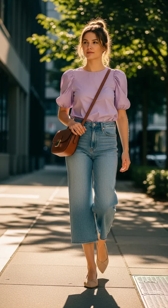 A fitted puff sleeve blouse with cropped wide-leg jeans strikes the perfect balance between structured and playful. This combo is effortless, casual, and ideal for shopping or coffee dates.