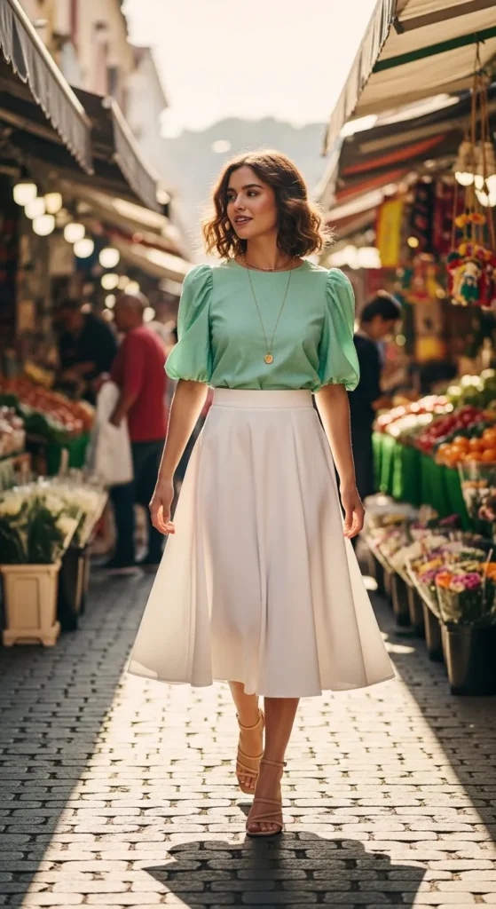 A puff sleeve blouse tucked into a high-waisted flared skirt gives a playful, vintage-inspired silhouette. Perfect for weekend outings, summer festivals, or outdoor markets.