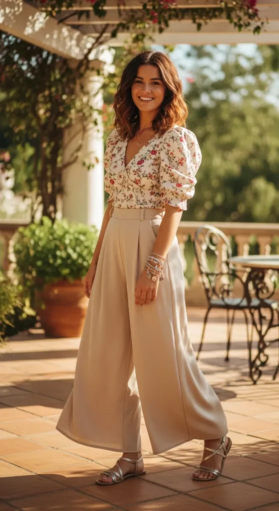 Pair a printed puff sleeve blouse with flowy palazzo pants for an effortlessly chic summer look. The combination is comfortable, stylish, and perfect for warm sunny days.
