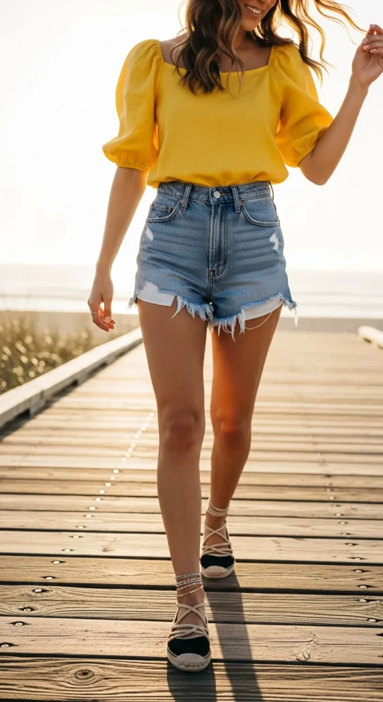 A colorful puff sleeve top paired with frayed high-waisted denim shorts brings out a carefree summer energy. Perfect for beach towns or casual weekend hangouts.