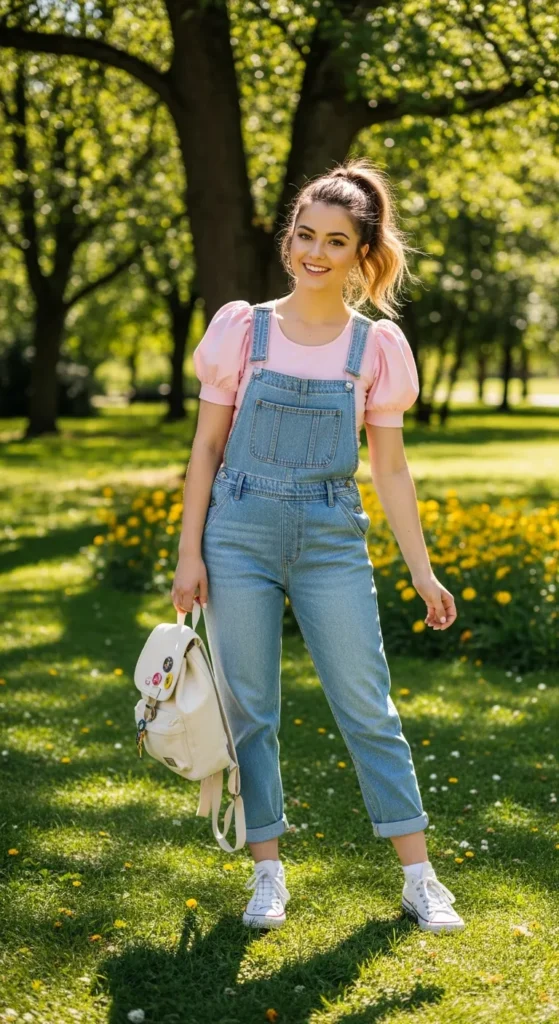 Layer a puff sleeve top under denim overalls for a whimsical, youthful outfit. This is perfect for day trips, parks, or creative weekend outings.