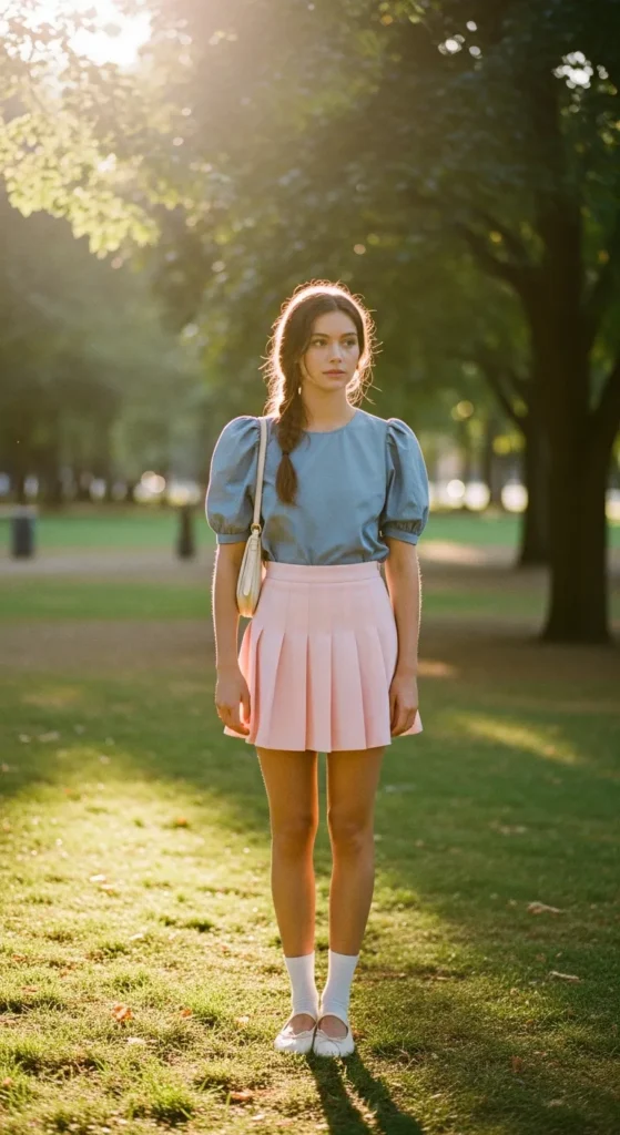 Pair a soft puff sleeve blouse with a pastel pleated mini skirt for a girly, playful outfit. This combination is perfect for summer picnics or casual brunches with friends.