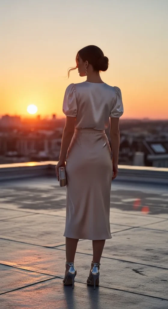A silky puff sleeve top paired with a midi slip skirt creates an elegant summer outfit with a touch of playfulness. Perfect for dinner dates or evening events.