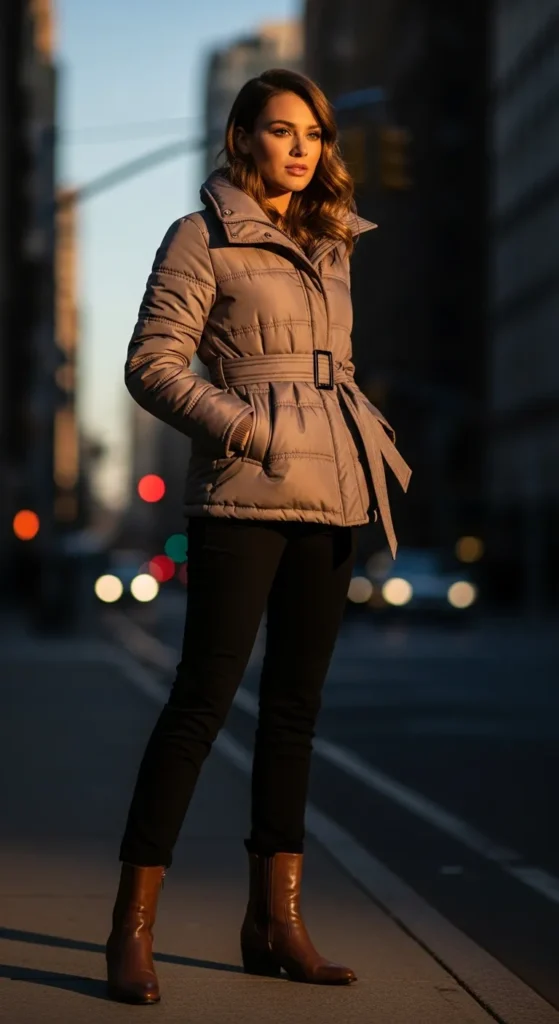 A belted puffer instantly adds shape and elegance while keeping warmth intact. Paired with slim jeans, it creates a flattering silhouette that works for everyday winter outings.