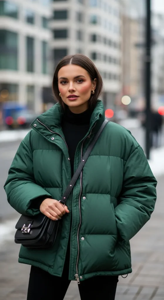 A boxy puffer makes a statement when paired with slim base layers. This contrast keeps the outfit modern, comfortable, and flattering for cold days.
