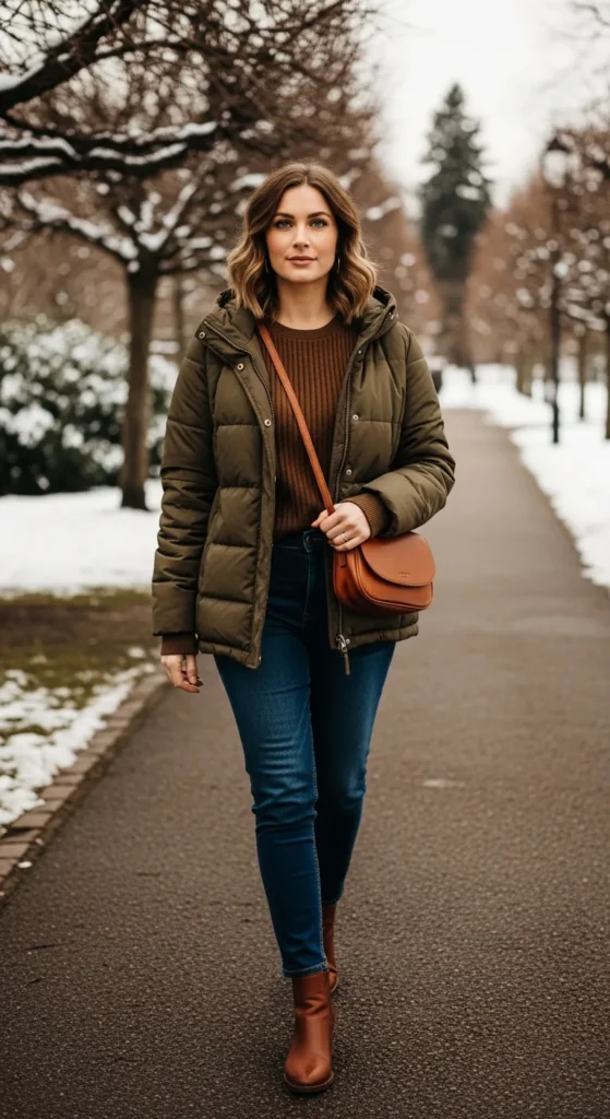 Earth tones feel warm and calming during winter. A puffer in these shades paired with a knit top creates a cozy, grounded outfit that feels natural and approachable.