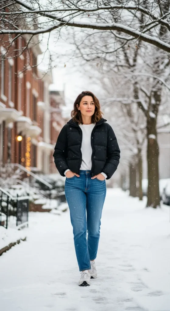 A soft neutral puffer paired with straight-leg jeans creates an easy winter uniform that feels relaxed yet put together. It’s cozy enough for cold days but still polished for casual meetups or everyday errands.