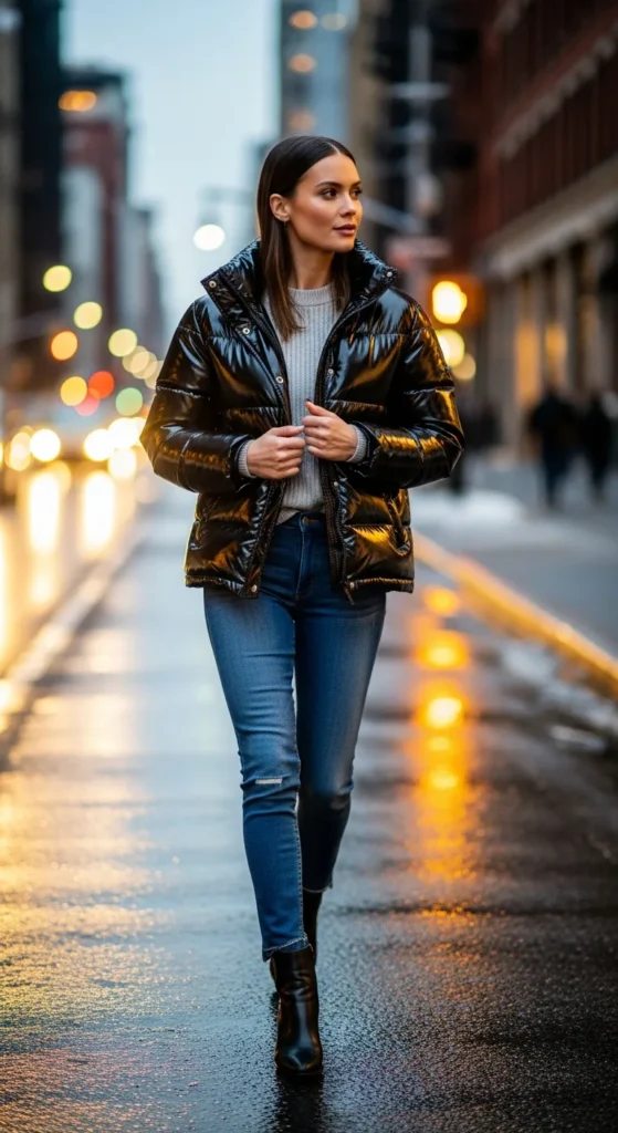 A slightly glossy puffer instantly elevates simple basics like jeans and a sweater. It adds personality while keeping the outfit grounded and wearable for everyday winter life.