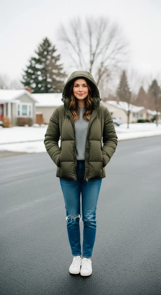A hooded puffer paired with classic denim feels practical and effortlessly cool. It’s the kind of outfit that works for errands, walks, and everyday winter routines.