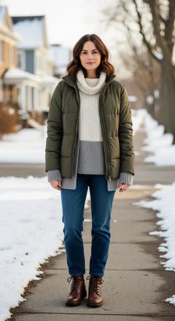 A lightweight puffer works beautifully with layered knits for milder cold days. This outfit feels cozy without overheating and looks naturally styled.