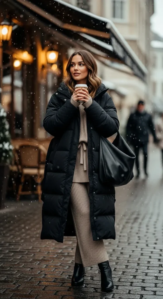 A long puffer layered over a matching knit lounge set feels like wearing a blanket outdoors, but styled the right way. It’s perfect for slow winter days, travel, or cozy coffee stops.
