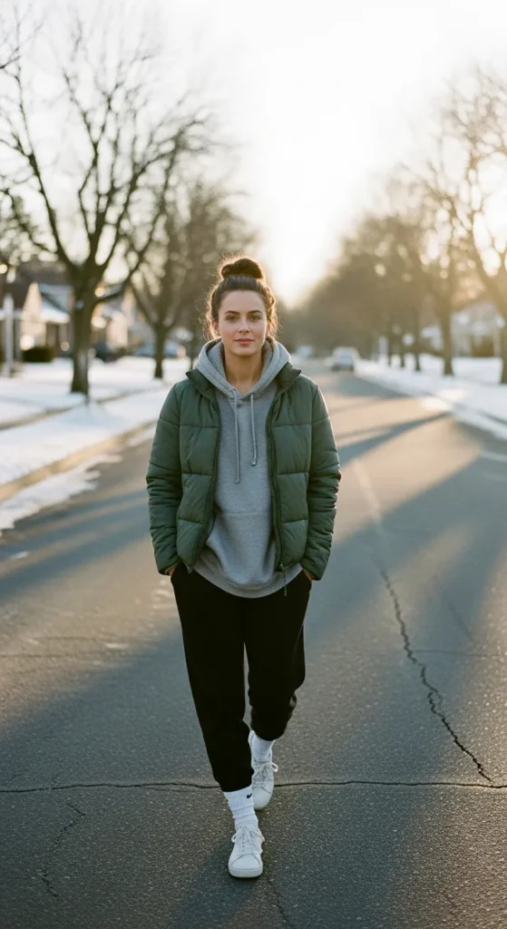 This is comfort dressing done right. A thermal base layered under a puffer with joggers feels practical, warm, and ideal for long winter days on the move.