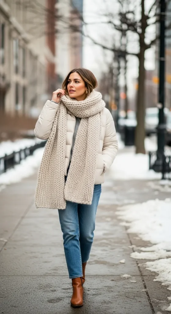 This outfit feels instantly cozy and lived-in. A chunky scarf layered with a puffer adds texture and warmth, making it perfect for cold mornings and relaxed winter routines.