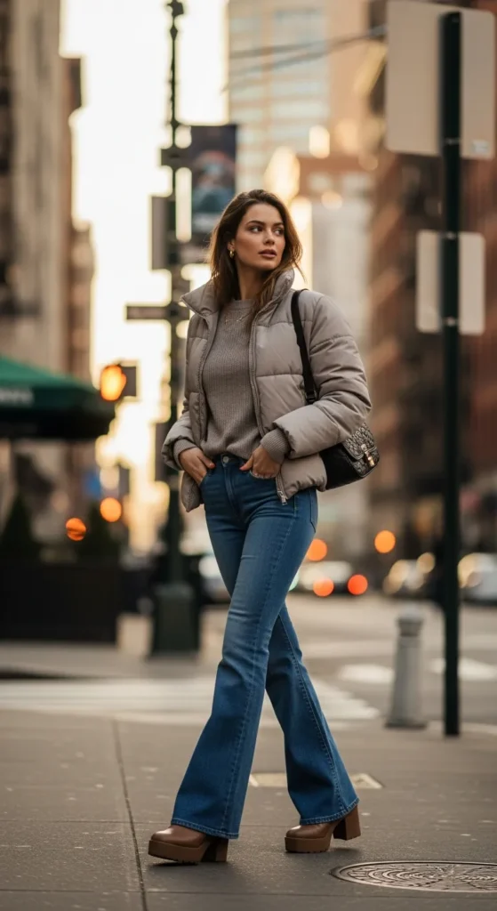 Flared jeans add subtle drama to a cozy puffer outfit. This combination feels balanced, flattering, and perfect for casual winter days with a hint of personality.
