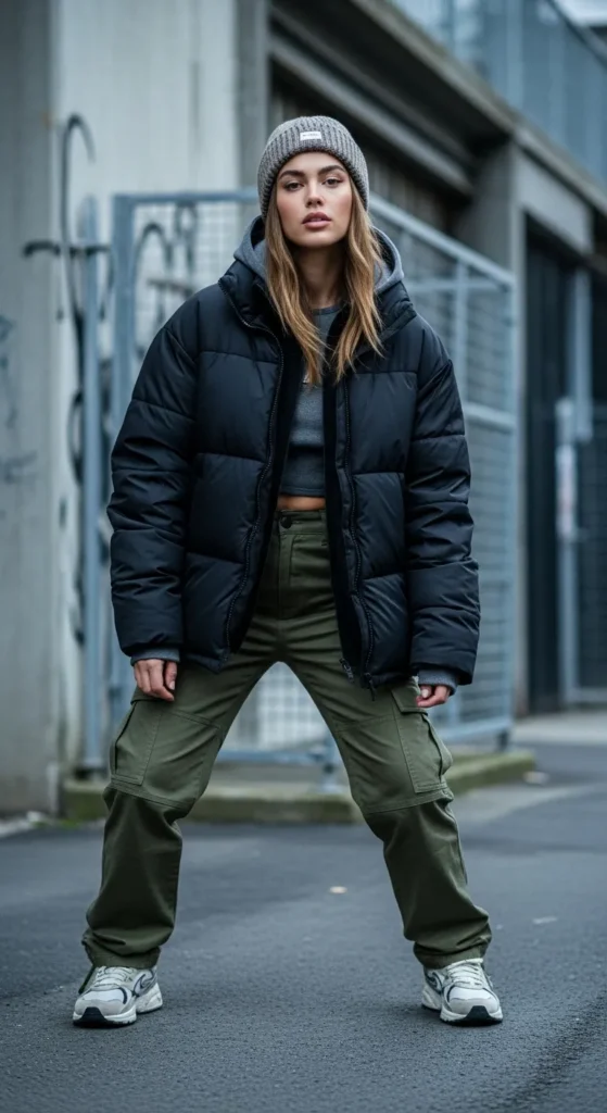 Cargo pants bring a casual, functional edge to a cozy puffer jacket. This outfit feels practical yet stylish, perfect for long days out or travel-heavy winter schedules.