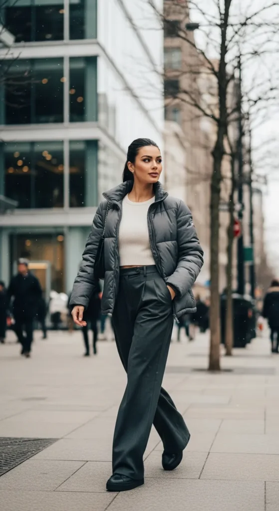 Wide-leg pants paired with a puffer feel relaxed yet fashion-forward. This outfit works well for city days when you want comfort without sacrificing personal style.