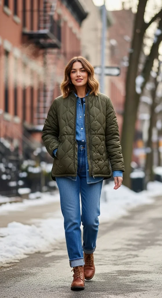 Layering denim under a quilted puffer adds texture and warmth while keeping the outfit familiar and wearable. It feels effortlessly cool and very everyday-friendly.