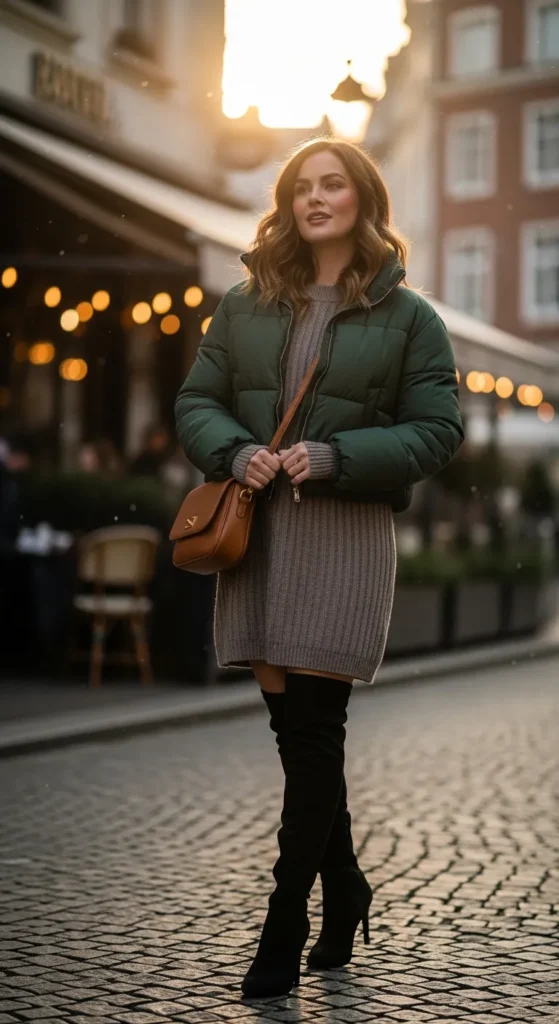 A short puffer over a sweater dress creates a cozy contrast between structure and softness. It’s warm, flattering, and easy for casual winter plans without overthinking.