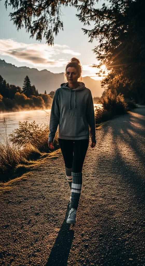 Athletic hoodie paired with leggings and layered leg warmers is perfect for chilly early mornings and adds an urban sporty aesthetic for casual exploration.