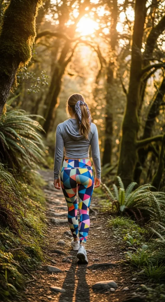 A fitted hoodie paired with printed outdoor leggings is ideal for mild-weather hikes and adventure sports. The outfit ensures mobility and adds a pop of color with patterns.