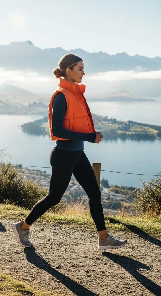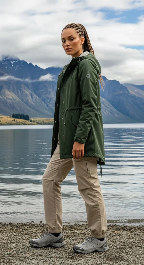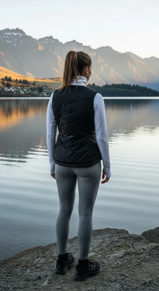 A navy softshell jacket combined with slim-fit hiking pants allows flexibility and wind protection. Ideal for cliffside hikes or bike tours through Queenstown’s hills.