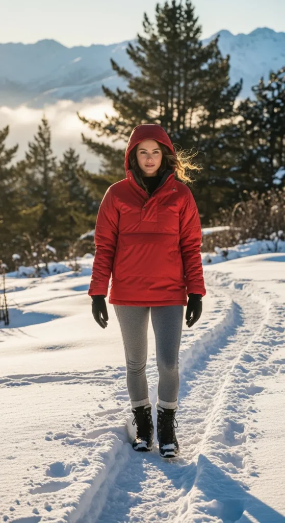A bright insulated anorak over thermal base layers ensures warmth during early winter treks. Contrasting colors make you stand out against snowy trails.