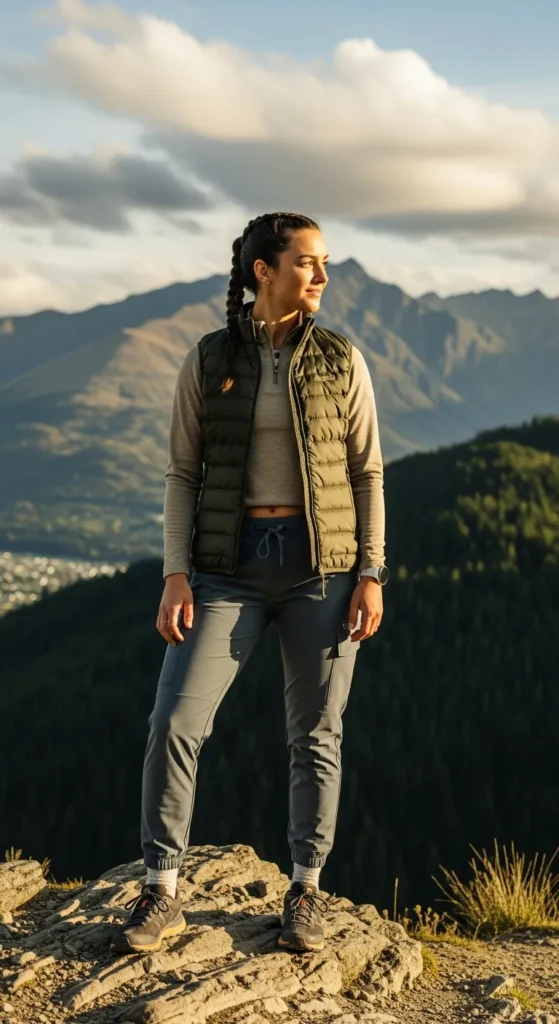 Layering an insulated vest over a long-sleeve top and cargo joggers balances warmth and functionality. Pockets add practicality for small items on hikes or cycling trips.