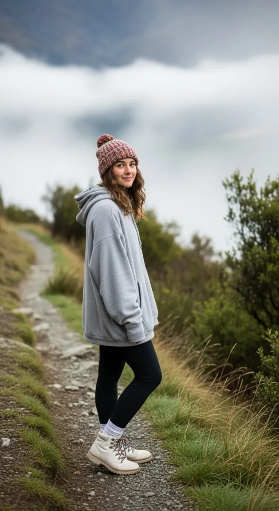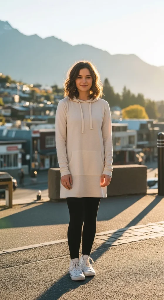 A hoodie dress layered over athletic leggings combines casual charm with functionality, perfect for town strolls or light adventure.