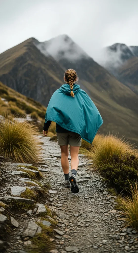 A softshell poncho paired with durable hiking shorts offers easy layering and mobility, ideal for sudden weather changes during mountain hikes.