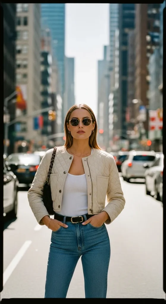 A cropped quilted jacket paired with a basic tank and high waisted jeans creates a balanced silhouette that feels youthful, cozy, and effortlessly modern.