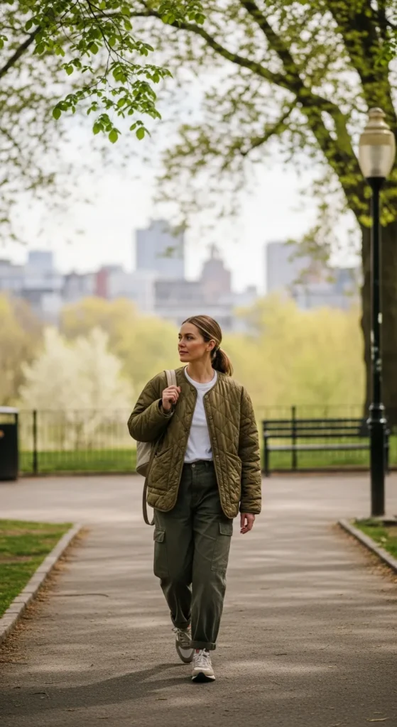 A khaki quilted jacket layered over a basic white tee and relaxed cargo pants creates a practical yet stylish outfit that feels ready for movement while still looking thoughtfully styled.