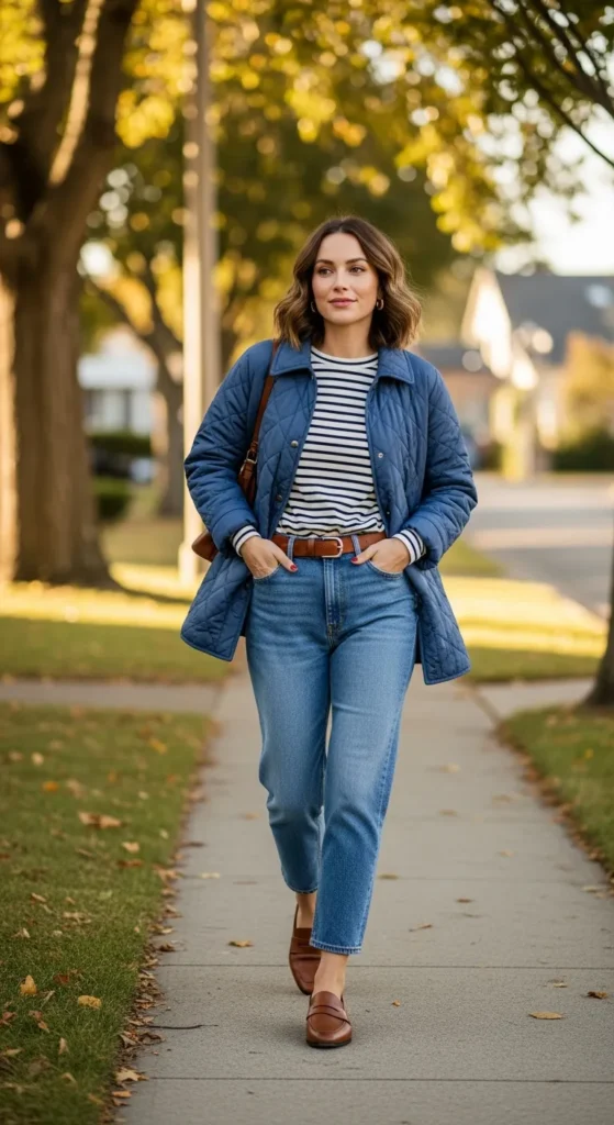 A classic blue quilted jacket worn over a striped long sleeve tee and relaxed mom jeans brings nostalgic comfort with a fresh edge, ideal for casual afternoons that still call for personal style.