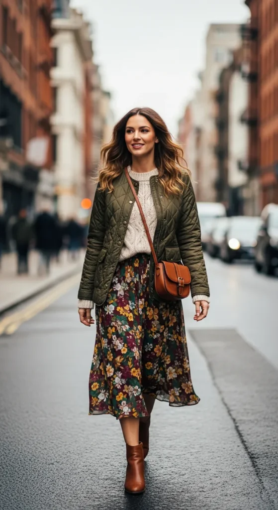 A quilted jacket layered over a tucked knit sweater and midi skirt creates a cozy yet expressive outfit that feels warm, balanced, and refreshingly different from typical winter layers.