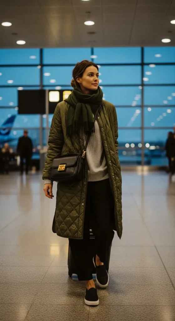 A long quilted jacket layered over a soft sweatshirt and relaxed pants creates a travel friendly outfit that feels warm, calm, and comfortable for long days out.