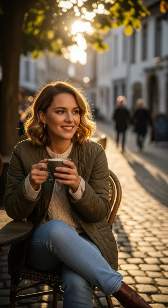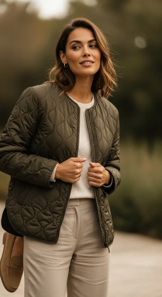 A muted green quilted jacket over a warm cream sweater and light jeans adds gentle color without overpowering the look, making it feel cozy yet visually interesting.
