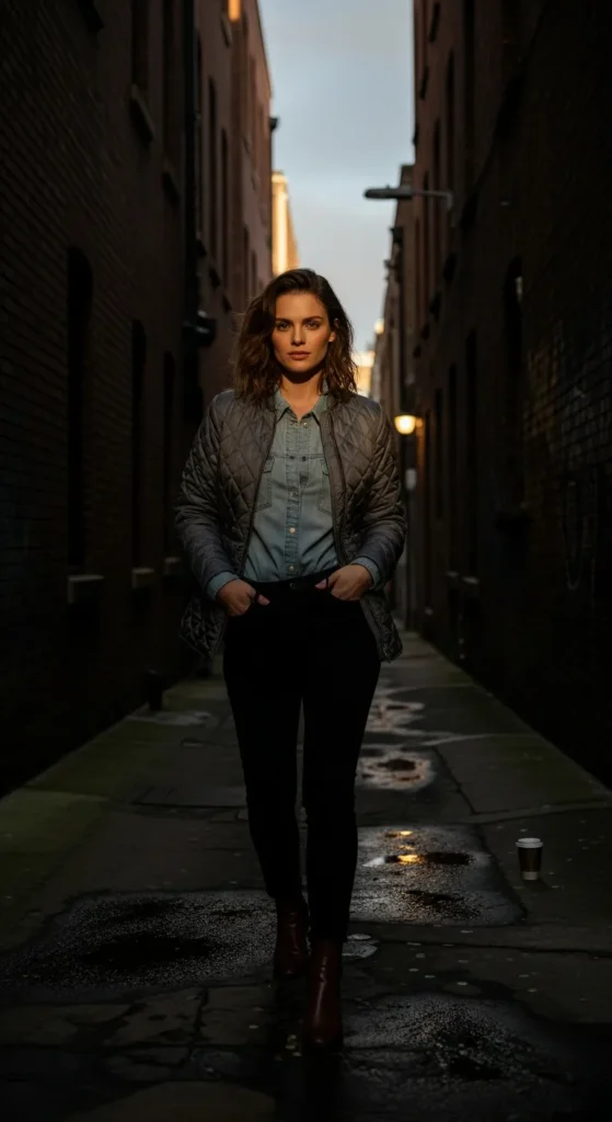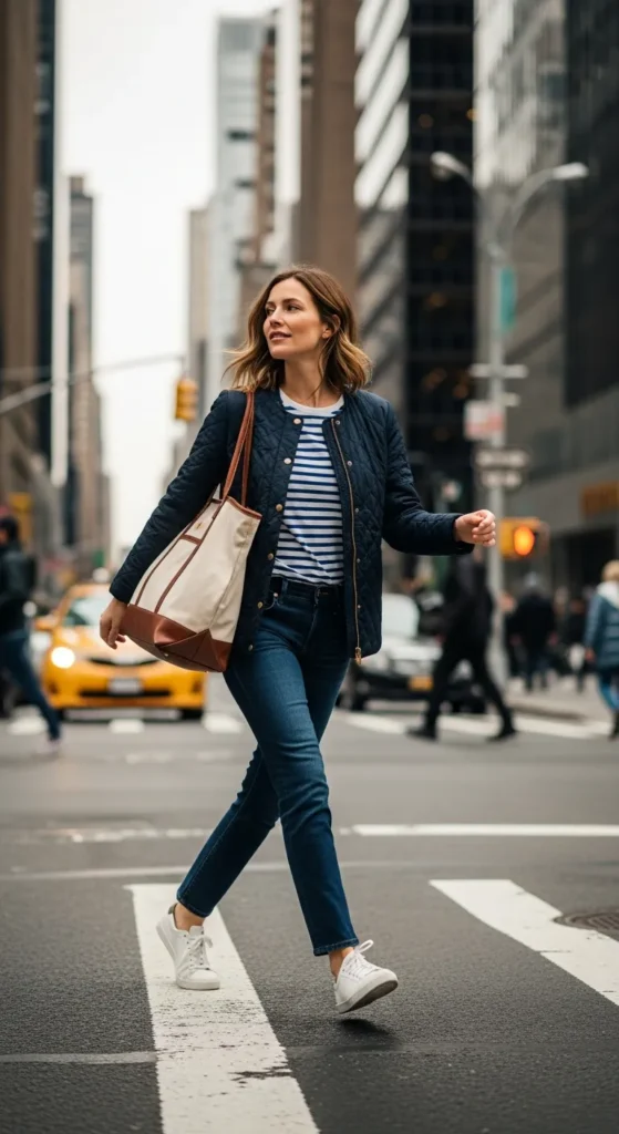 A navy quilted jacket worn with a striped tee and dark jeans creates a familiar, comforting outfit that feels perfect for everyday city movement without sacrificing style.